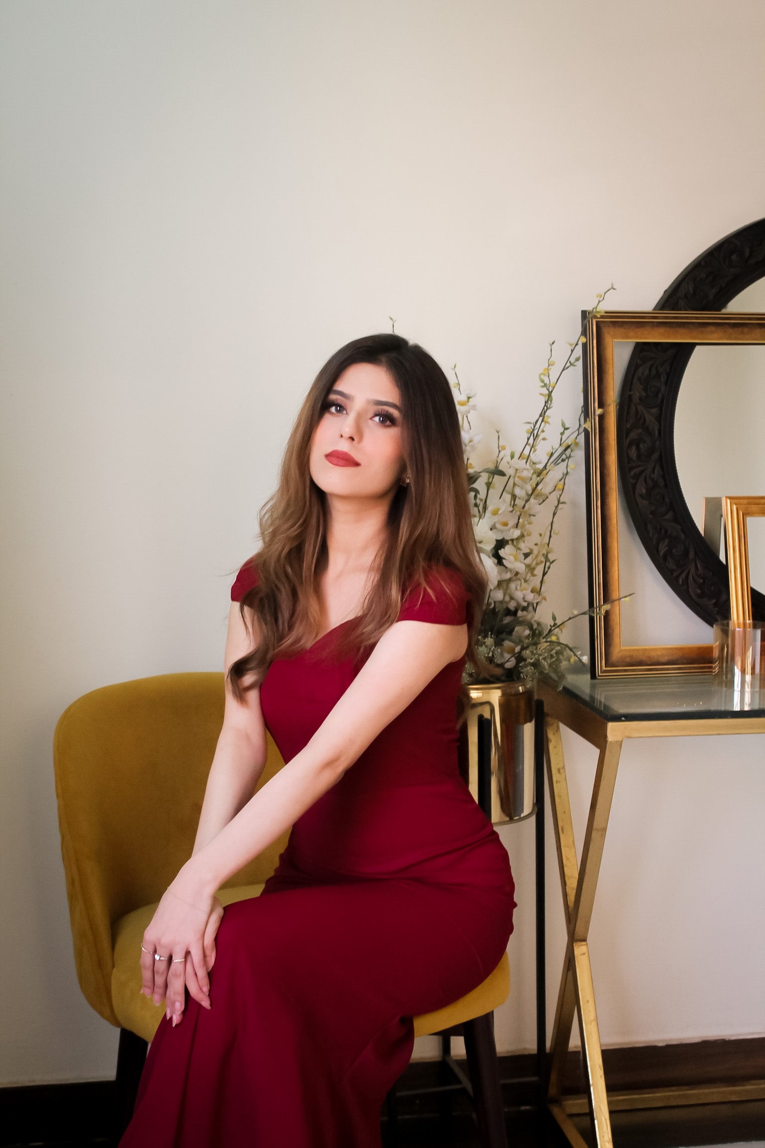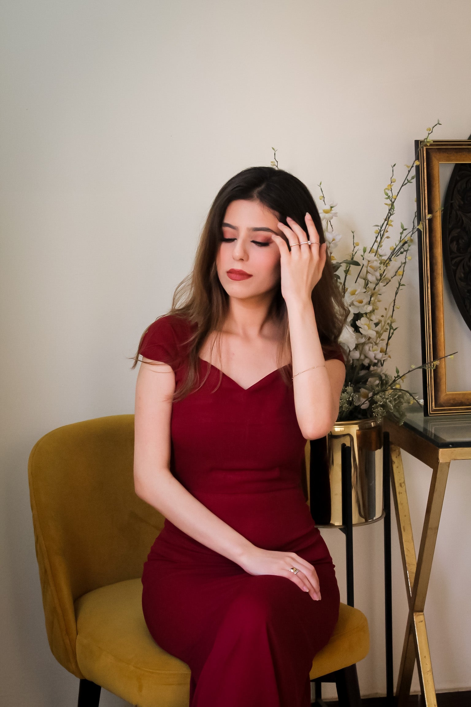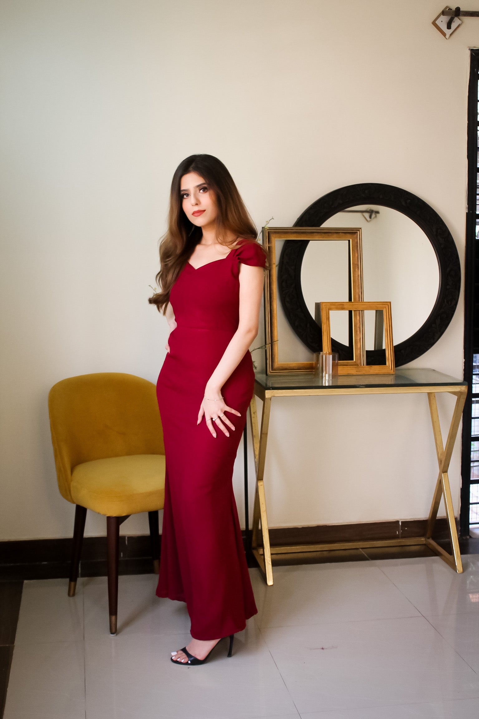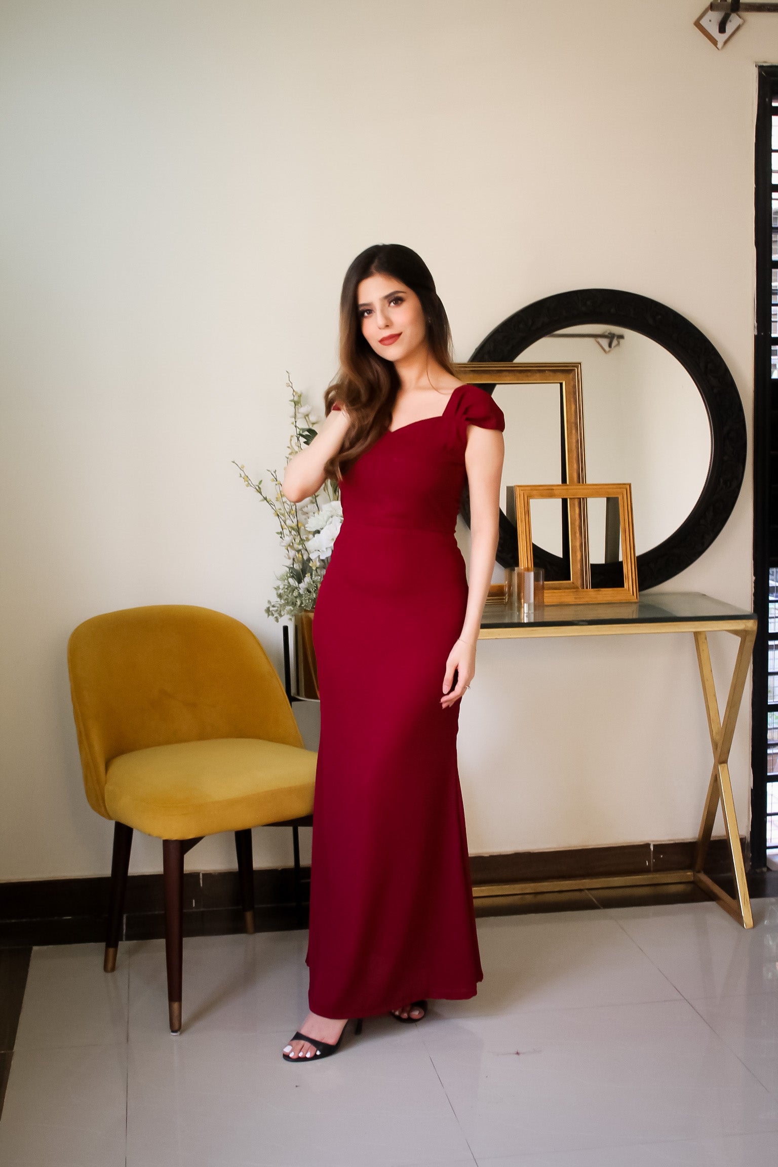 Beautifully curated red-maroon gown with small pleated cap sleeves, fitted sillouette and deep neckline.